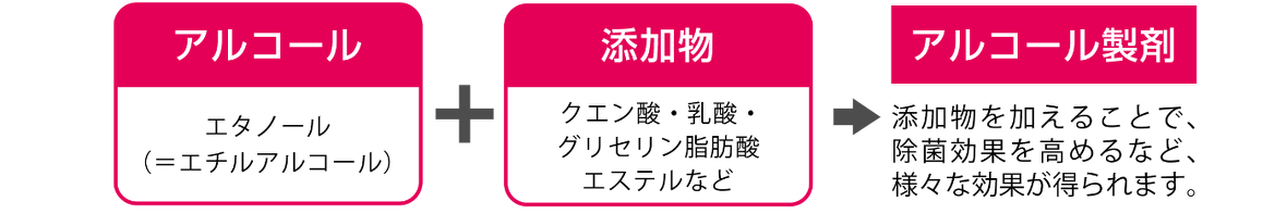 アルコール製剤は、エタノールを主成分とし、有機酸などの添加物を加えて作られた製剤です。エタノールの除菌効果がもっとも高い濃度は70w/w%程度ですが、アルコール製剤は、その他の成分を配合することにより、濃度がやや低くても同等の除菌力が得られるように工夫して製造されています。