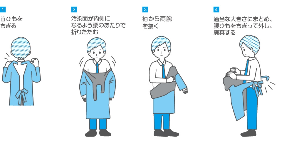 - 着用前と脱いだ後に必ず手指衛生を行います。