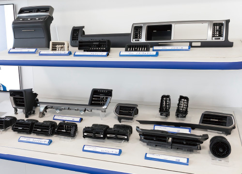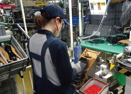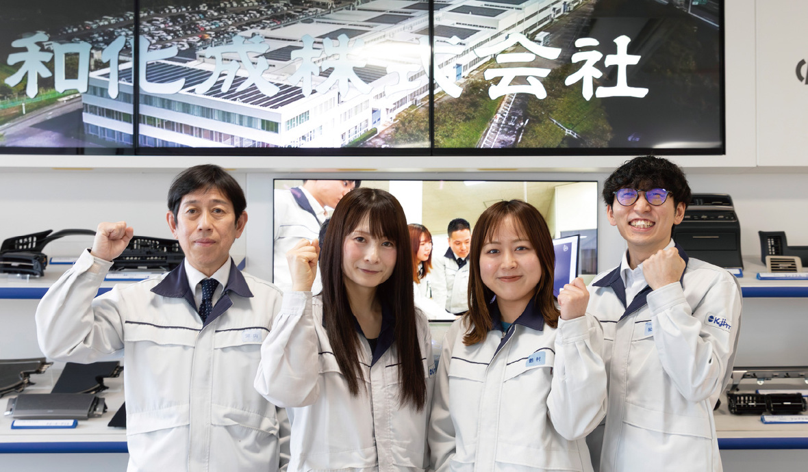 当社は自動車用のプラスチック部品の製造販売を行っている会社です。主要製品は車室内への風の吹き出し口(レジスタ)や乗員をサポートするアシストグリップなどを設計開発から生産出荷まで一気通貫でものづくりを行い、常に車内空間の快適性を追求しています。従業員は505名(2025年3月時点)で、ここ本社工場にほとんどの従業員が在籍しており、事務作業者が4割、現場作業者が6割くらいの割合です。