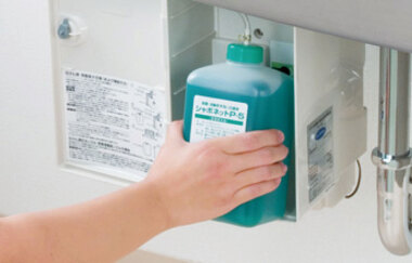 手指を触れることなく石けん・水・消毒液が吐出するため、機器を介しての交差汚染の心配なく衛生的な手洗いが行えます。