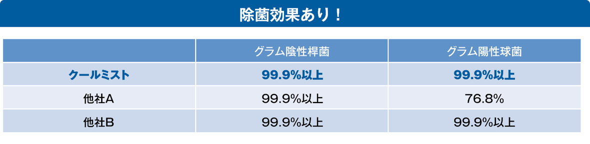 クールミストはエタノール成分と抗菌成分配合で、各種細菌に対して高い除菌効果を示しました。