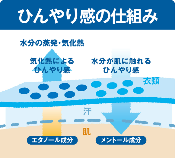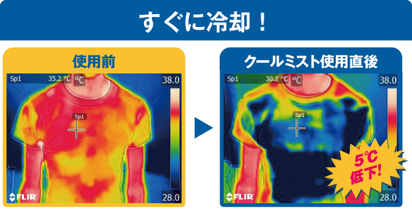 衣類にクールミストを噴霧し、すぐに着用した場合、表面の温度が5℃下がりました。