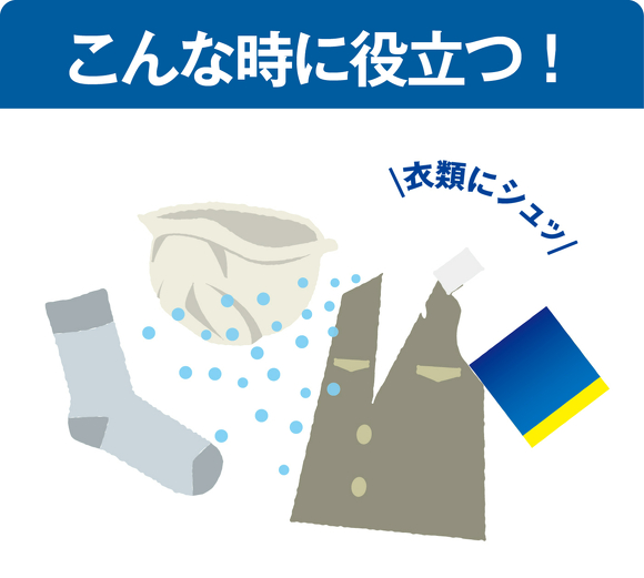 | 使用方法 | ●スプレーの先端部分を「ON」にし、直用する前の衣類に約20~30cm離し、表面全体が湿り気をおびる程度にスプレーしてください。 ●過度な刺激になるおそれがありますので、一箇所に集中してスプレーしないでください。 ●衣類を着たままスプレーする際には、肌に直接かからないように注意してください。 ●保管時は先端部分を必ず「OFF」にしてください。 ※襟元や背中、わきなど、汗をかきやすい衣類の箇所に使用すると効果的です。 |