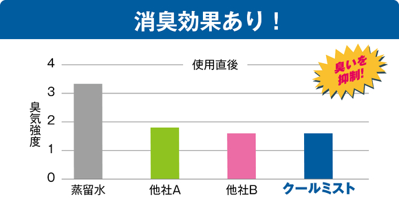 数値が低いほど消臭効果が高くなります。クールミストは、使用直後から汗などの臭いを抑制する効果がみられました。