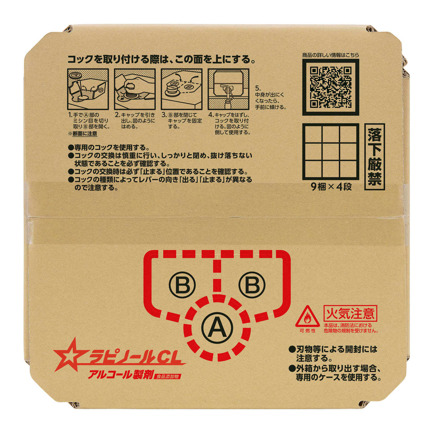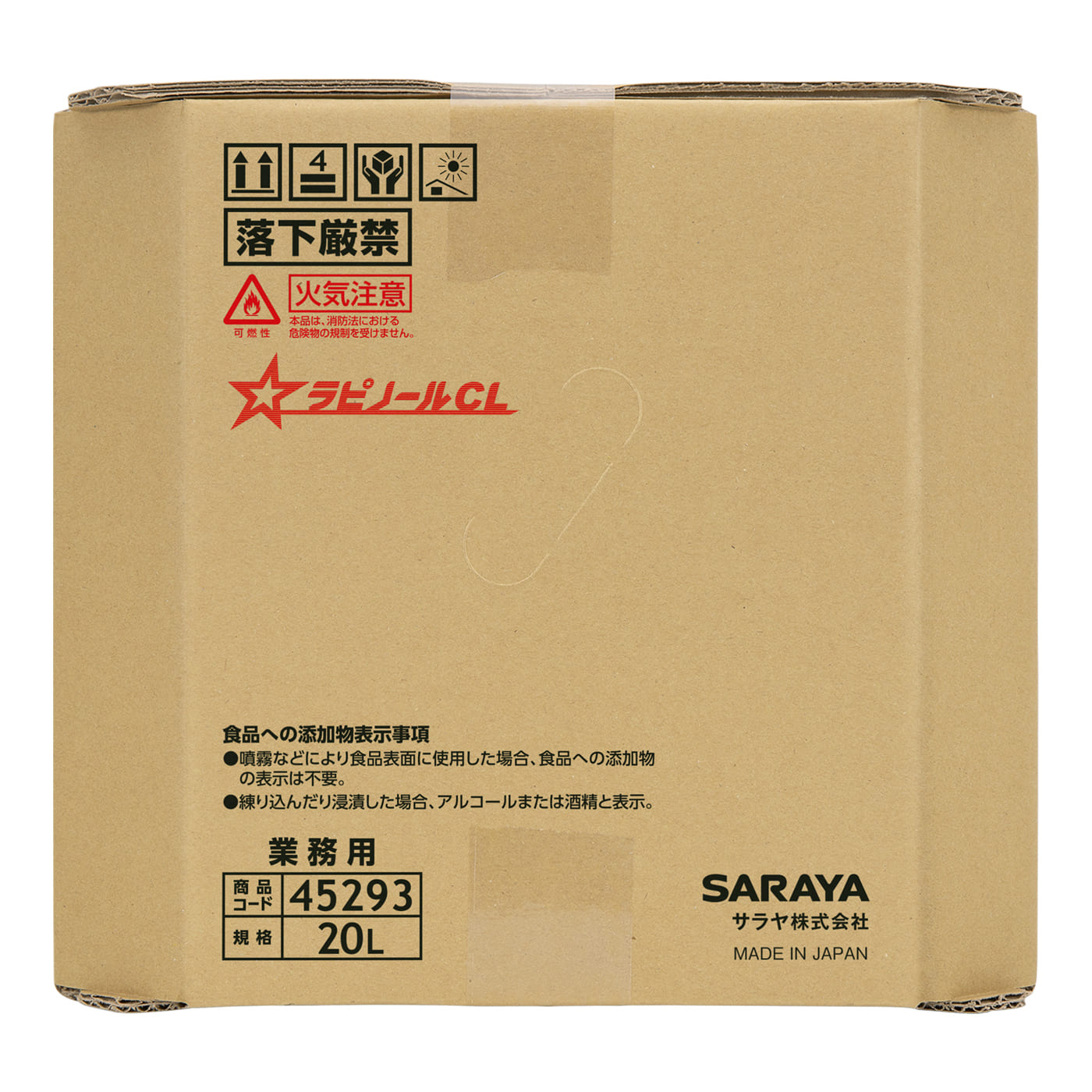 | 使用上の注意 | ● 用途以外に使用しない。 ● 飲用しない。 ● 火気、高温の物に近づけない。● この製品を使用するときに、飲食または喫煙をしない。 ● 屋外または換気の良い場所で作業し、ミスト・蒸気・スプレーの吸入を避ける。 ● 作業時は状況に応じて、保護マスク、保護メガネおよび保護手袋を使用する。 ● 取扱い後は、目および手をよく洗う。 ● キャップを開けるとき、また容器を移動するときに緩んでいると、液が飛び跳ねることがあるので注意する。 ● 使用後の容器は洗浄処理する。 ● 内容物や容器は、国や各自治体の規則に従って廃棄する。 ● 初期消火の場合、大量の水または消火器で消火する。 ● すべての菌やウイルスを除去するわけではない。 |