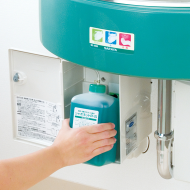 センサー感知で石けん液・給水・消毒液を自動供給するので、機器に手を触れることなく手指の洗浄・消毒が可能です。カギ付き。