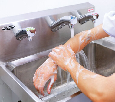 手指を触れることなく石けん・水・消毒液が吐出するため、機器を介しての交差汚染の心配なく衛生的な手洗いが行えます。