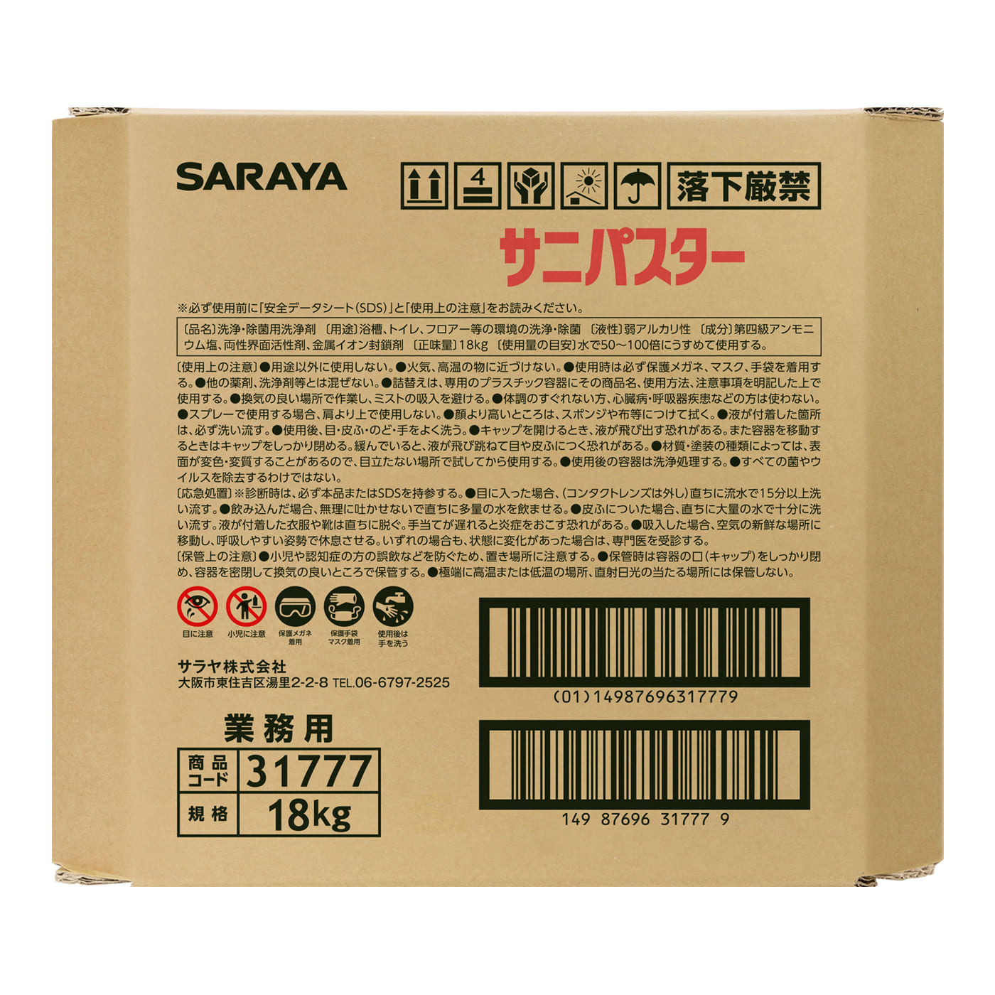 | 使用上の注意 | ●用途以外には使用しない。 ●火気、高温の物に近づけない。 ●使用時は必ず、保護メガネ、マスク、手袋を使用する。 ●他の殺菌剤、洗浄剤等とは混ぜない。 ●詰替えは、専用のプラスチック容器にその商品名、使用方法、注意事項を明記した上で使用する。 ●換気の良い場所で作業し、ミストの吸引を避ける。 ●体調のすぐれない方、心臓病・呼吸器疾患などの方は使わない。 ●スプレーで使用する場合、肩より上で使用しない。 ●顔より高いところは、スポンジや布等につけて拭く。 ●液が付着した箇所は、必ず洗い流す。 ●使用後、目・皮ふ・のど・手をよく洗う。 ●キャップを開けるとき、液が飛び出す恐れがある。また容器を移動するときはキャップをしっかり閉める。緩んでいると、液が飛び跳ねて目や皮ふにつく恐れがある。 ●材質・塗装の種類によっては、表面が変色・変質することがあるので、目立たない部分で試してから使用する。 ●使用後の容器は洗浄処理する。 ●すべての菌やウイルスを除去するわけではない。 【応急処置】 ※診断時は、必ず本品またはSDSを持参する。