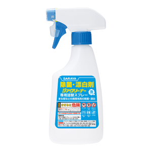 | 使用方法 | 専用のスプレーボトルに詰替え、汚れに直接スプレーし、5分ほど置いた後、必ず流水で十分に洗い流す。 【使えるもの】 プラスチック製品、木・竹製品、ガラス製品、陶磁器、ステンレス製品 【使えないもの】 銅・アルミなどの金属製の容器・用具、漆器、色物・柄物のせんい製品、毛・絹・ナイロン・アセテート及びポリウレタンのせんい製品、獣毛製のハケ、メラミン食器、大理石、水洗いできない製品や場所 |