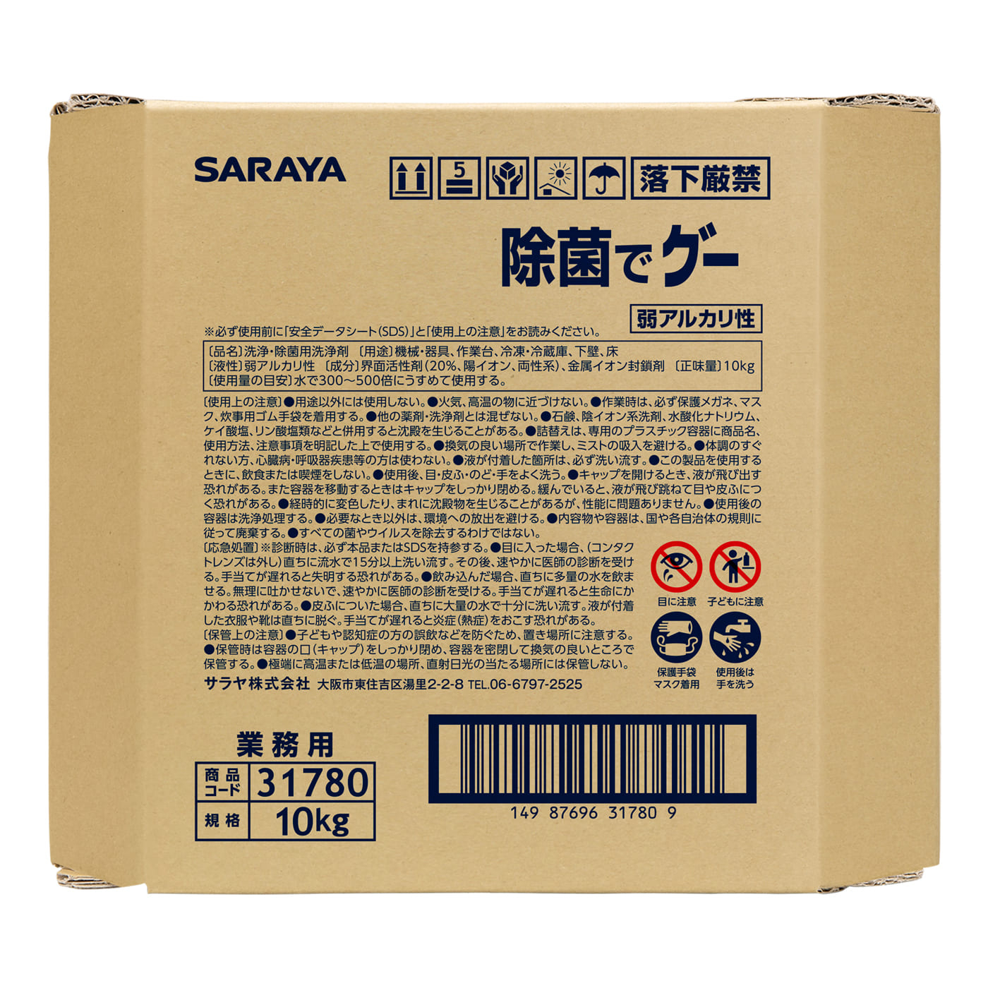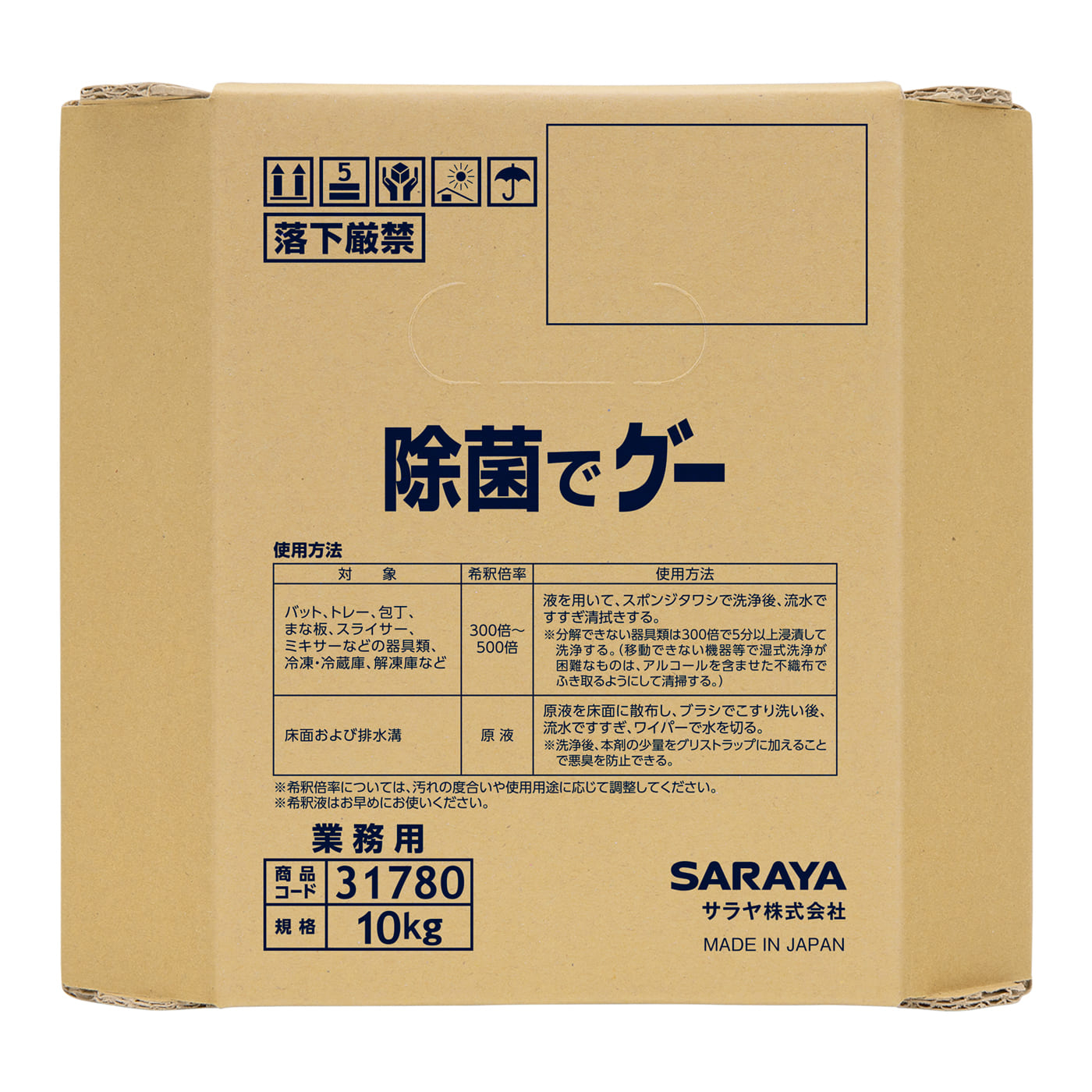 | 使用方法 | 【調理器具類】 希釈倍率:300倍~500倍 液を用いて、スポンジタワシで洗浄後、流水ですすぎ清拭きする。 【床面および排水溝】
