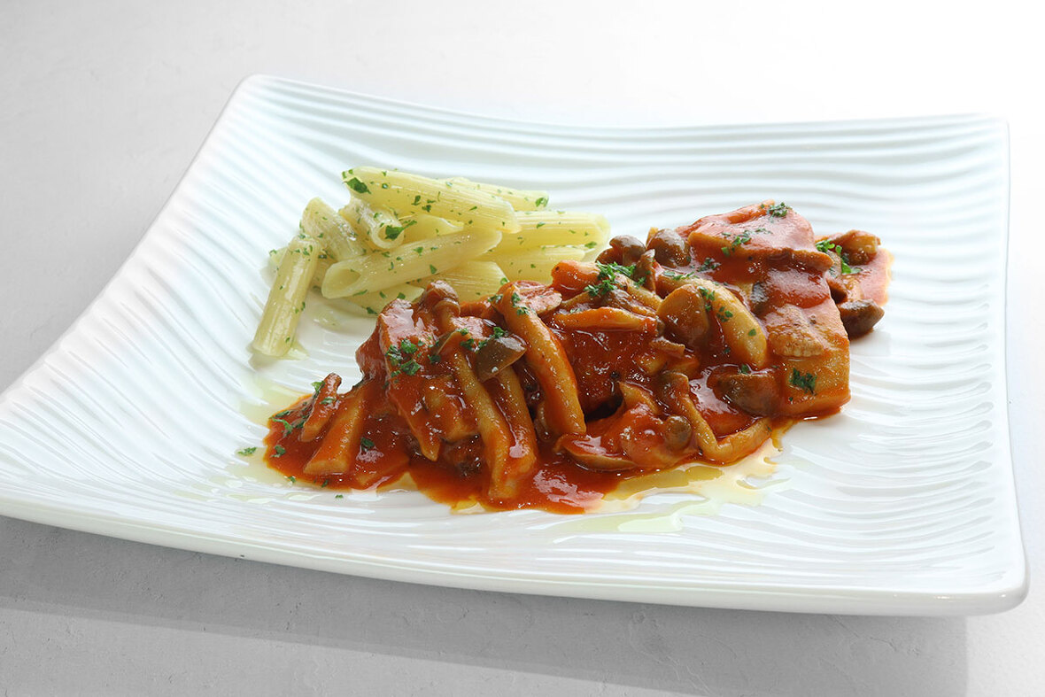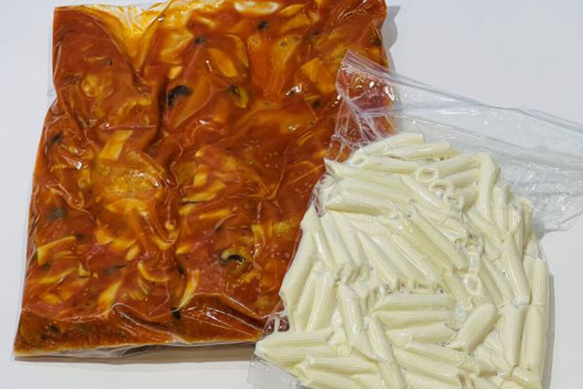 2023年04月17日(月) 若鶏とキノコのトマト煮込み‟カチャトーラ”ペンネ添え バリオで自動調理することで、安定した調理が可能となり、出来立て料理を冷ますことなく包装・凍結保管することができます。 ◆加工工程 《調理:スチコン》 自動調理モード/肉《グリル》:約10分 鶏肉を焼き、両面焼けたら、具材、ソースを加えて煮る 自動調理モード/副菜《パスタボイル》:約5分 オートリフト機能で自動で給水・加熱・取り出し 《包装:シュットマン》 《急速凍結:ラピッドフリーザー》 《再加熱:湯煎》