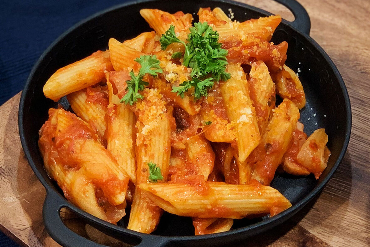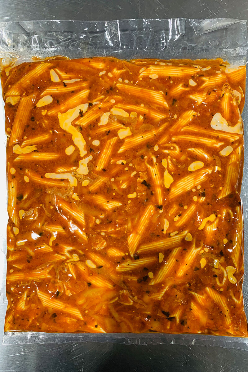 2023年04月17日(月) トマトペンネ 調理後、ホットパックし、急速凍結しておけば、オーダー時に必要な分だけ提供可能に。 ◆加工工程 《調理:スチコン》 【サイドディッシュパスタソース】トマトペンネ:11分 《包装:シュットマン》 《急速凍結:ラピッドフリーザー》 《再加熱:スチコン》 材料 分量 ペンネ 250g 玉ねぎ 1個 ベーコン 100g トマトバジルソース 2瓶 パセリ粉 適量 チーズ 適量 オリーブオイル 適量 ブラックペーパー 適量