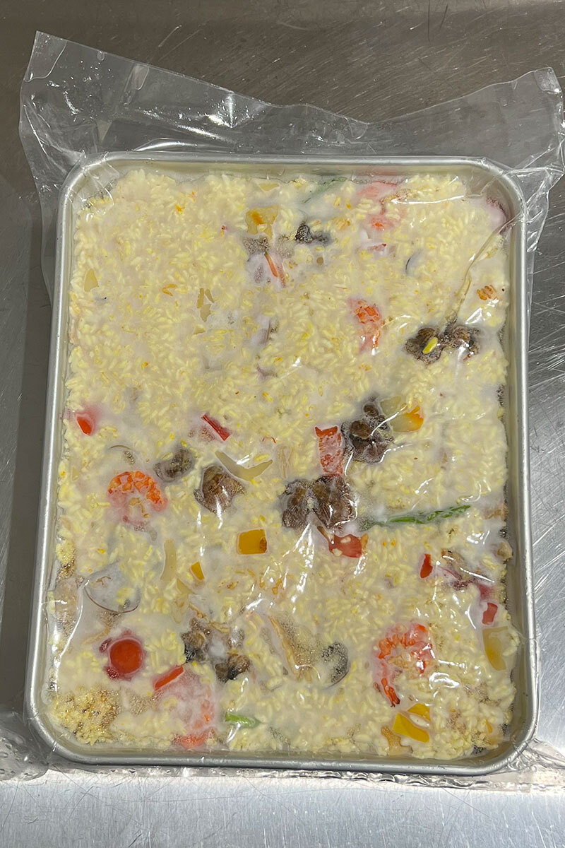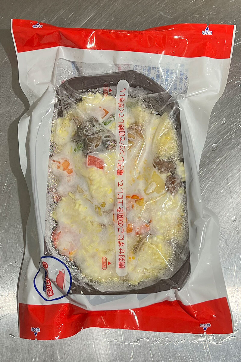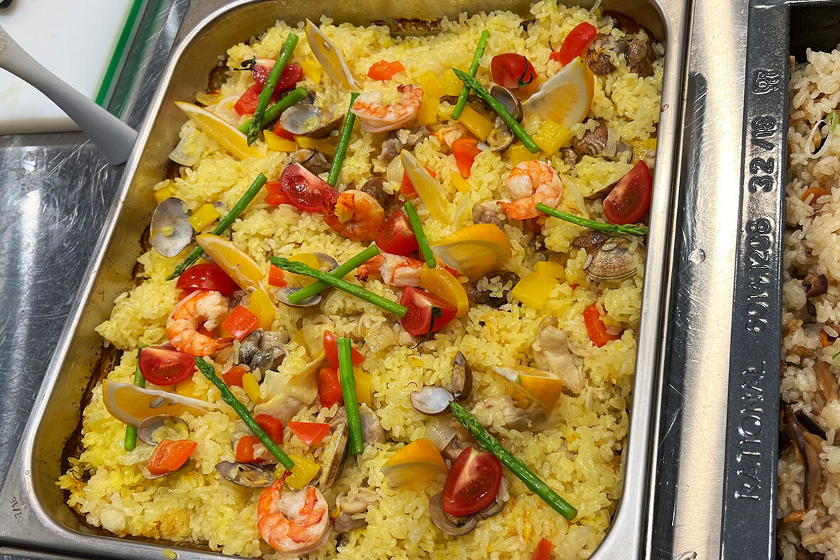 2023年04月17日(月) パエリア 一度に大量調理が可能に。ホテルパンごとホットパックし、急速凍結し、事前に調理することで、計画的に安定した味で提供することができます。 ◆加工工程 《調理:スチコン》 温度【C220℃/60%】3~5分炒める 温度【C220℃/60%】すべての具材を入れ20分加熱。完了後10分蒸らす 《包装:シュットマン》 《急速凍結:ラピッドフリーザー》 《再加熱:スチコン/電子レンジ》 バットに小分けして保存しておくことで必要時に再加熱するだけで提供可能に。 容器に入れてせいろパックに入れて冷凍保存。レンジで再加熱するだけで出来立ての美味しさに。通販やテイクアウトなどBtoC向けに。