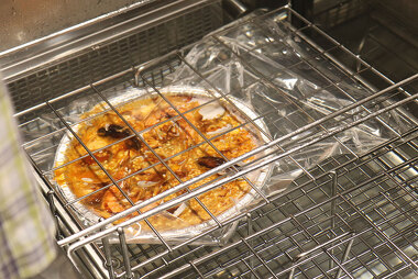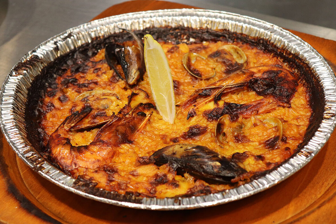 2023年04月17日(月) アリカンテ風 魚介のパエジャ~Paella Alicantina~ 鍋で調理後、アルミのパイ皿に移し、海老をのせてオーブンで加熱包装し、急速凍結をする。提供時はコンベクションオーブンで再加熱をし、提供。(家庭用オーブンレンジでも調理が可能) ◆加工工程 《調理》 《包装:シュットマン》 《急速凍結:ラピッドフリーザー》 《再加熱:湯煎》 材料 天使の海老 ピメントン アサリ サフラン ムール貝 サフリト 白身魚 レモン ヤリイカ 米 魚介の出汁