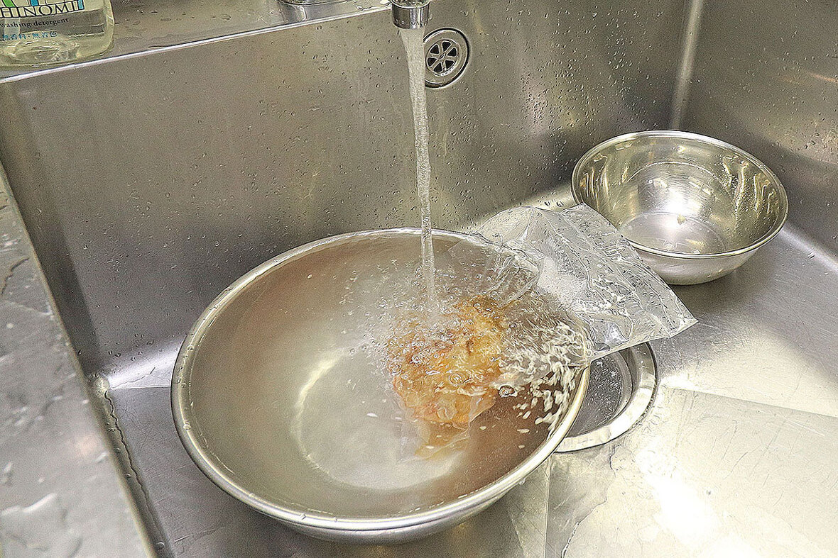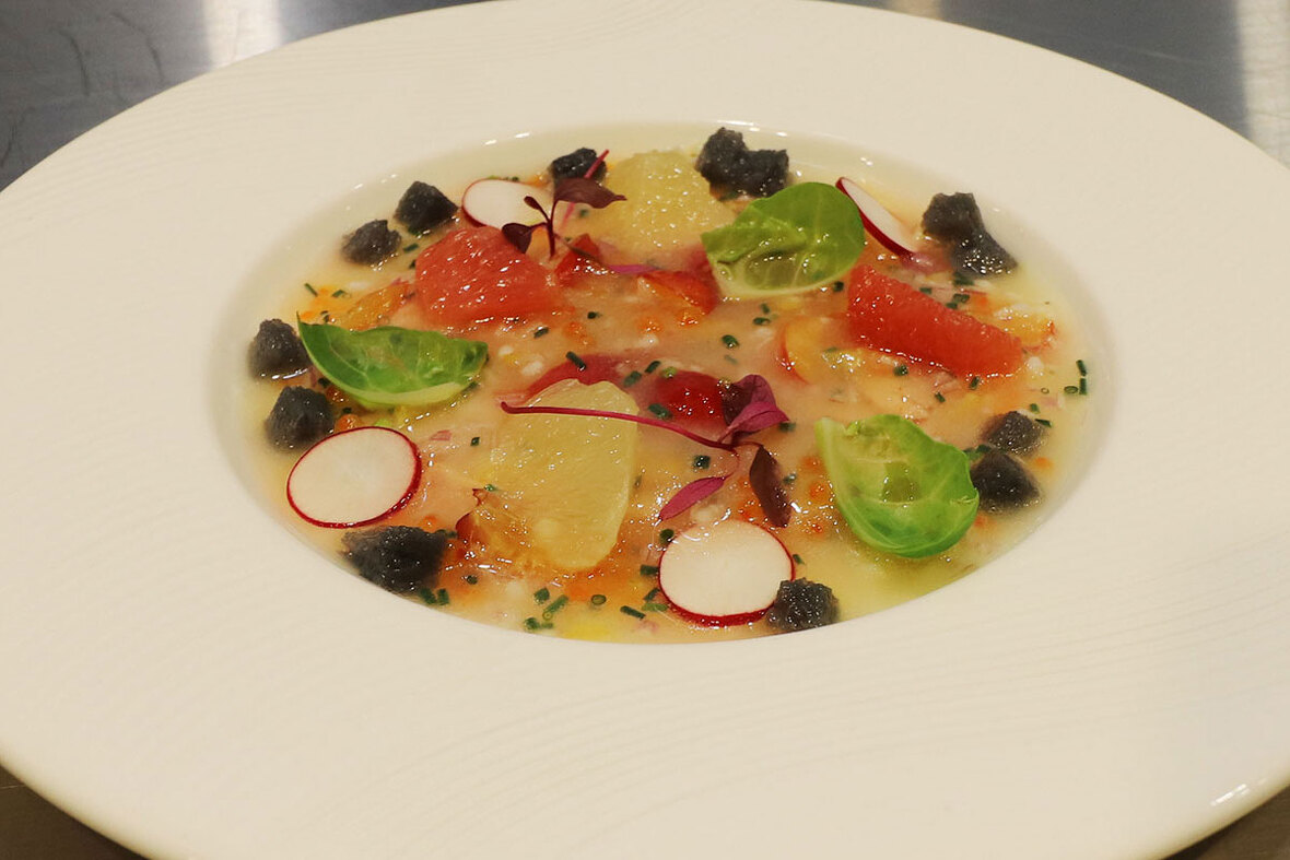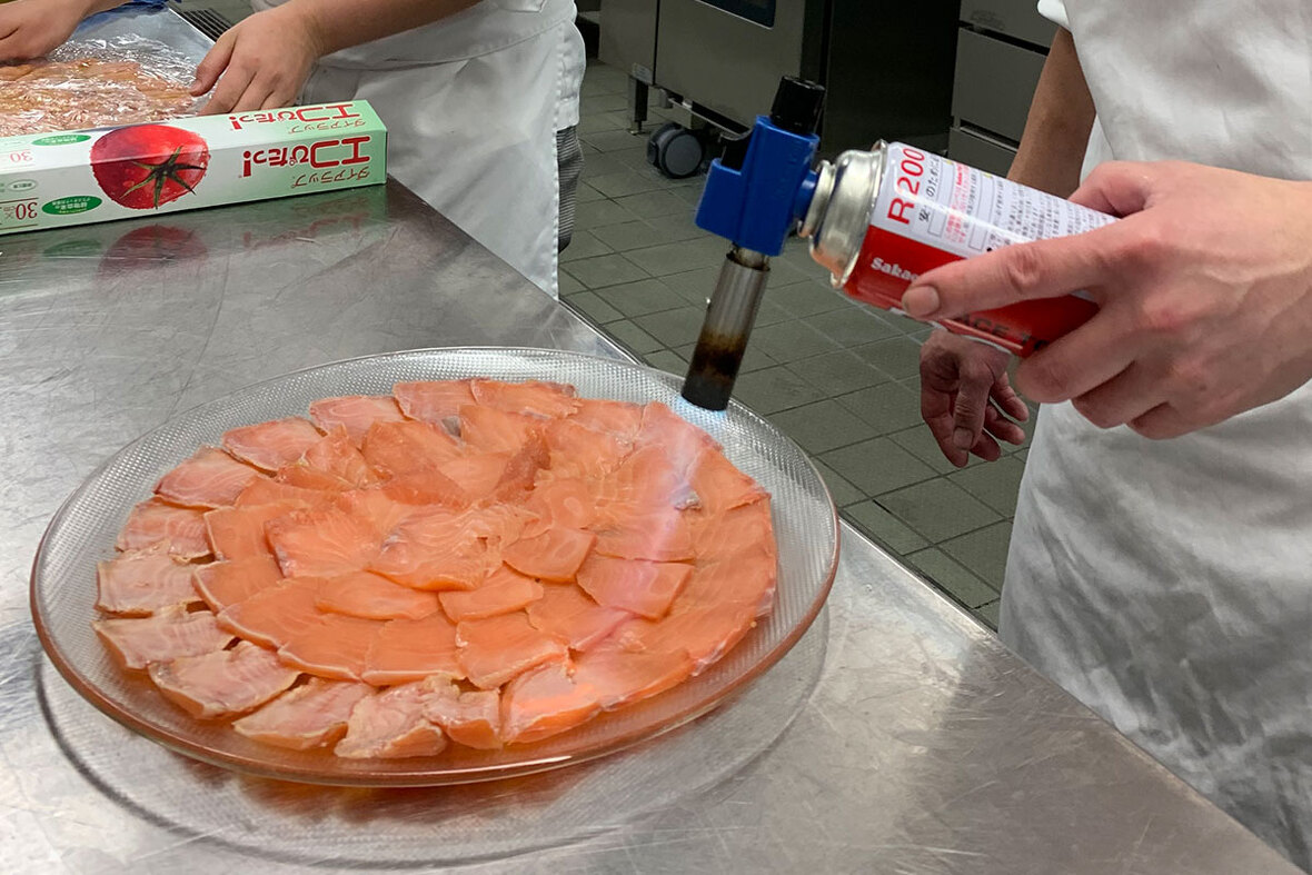 2023年04月17日(月) グレープフルーツの香りを付けた桜鱒のカルパッチョ サクランボと柑橘ジュレ ◆加工工程 《包装:シュットマン》 《急速凍結:ラピッドフリーザー》 《再加熱:流水》 桜鱒を凍結し、解凍後、スライスし、皿に敷いてバナーで軽く炙り盛り付ける。