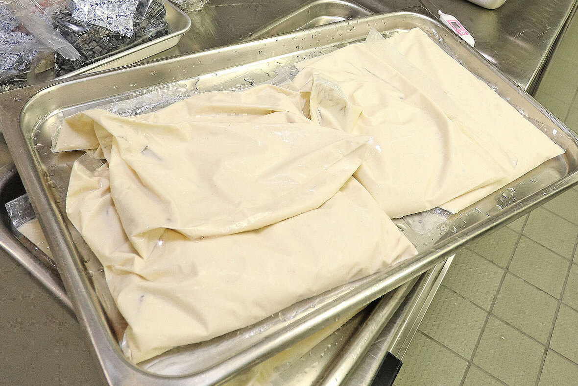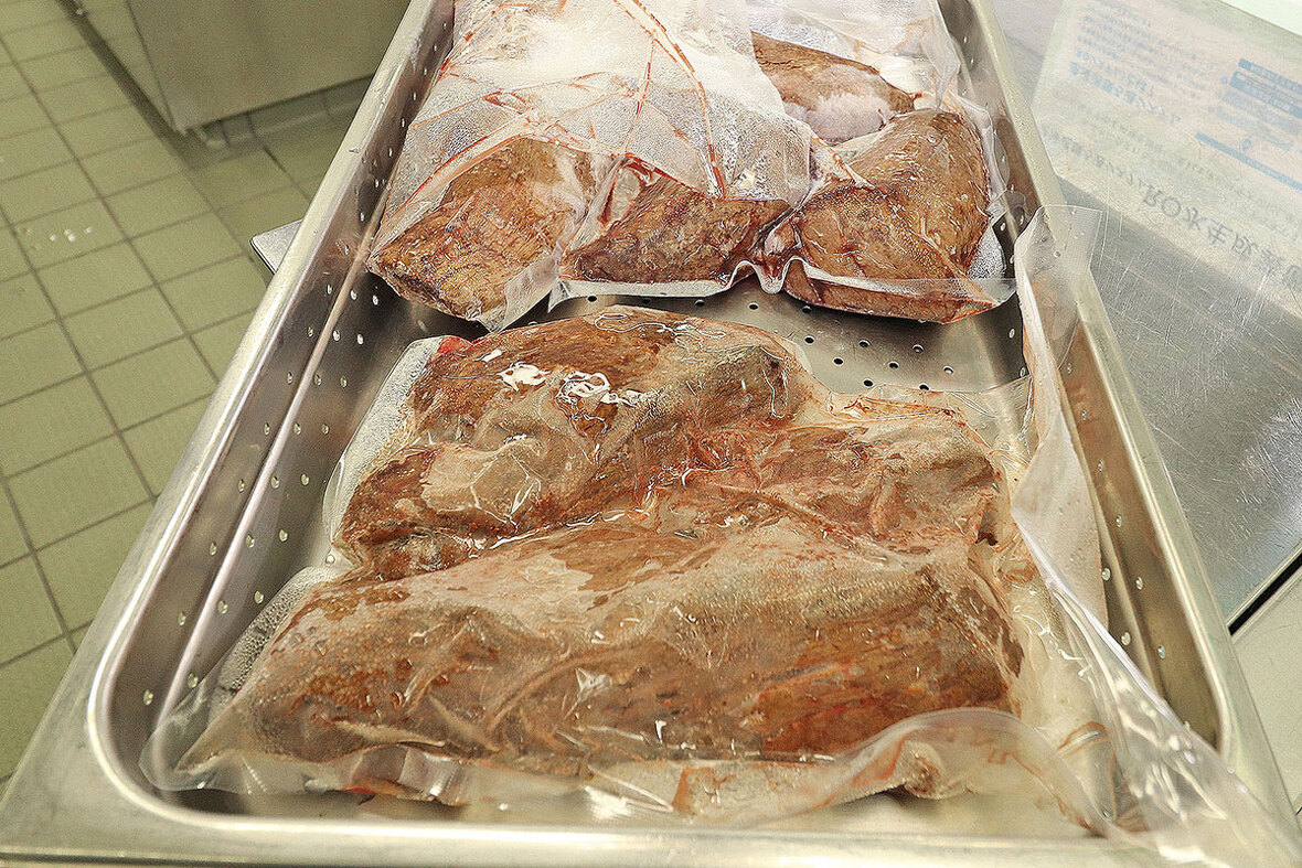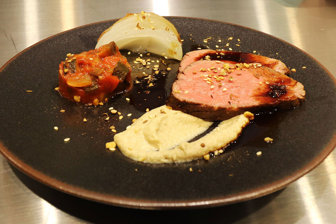2023年04月17日(月) 十勝若牛のフィレ肉のロースト&ババガナーシュ スパイス香る一皿 ◆加工工程 《調理》 《包装:シュットマン》 《急速凍結:ラピッドフリーザー》 《解凍》 フィレ肉は表面を焼いたあと、コンベクションオーブンで調理し包装・急速凍結。 52℃のお湯で解凍し、肉の表面を焼きスライスして提供。