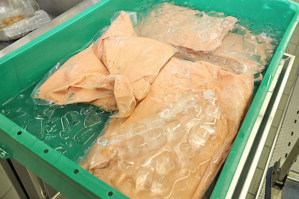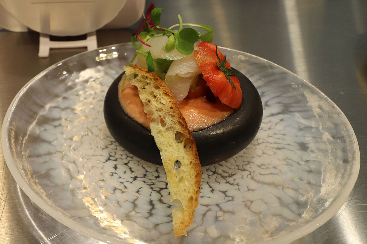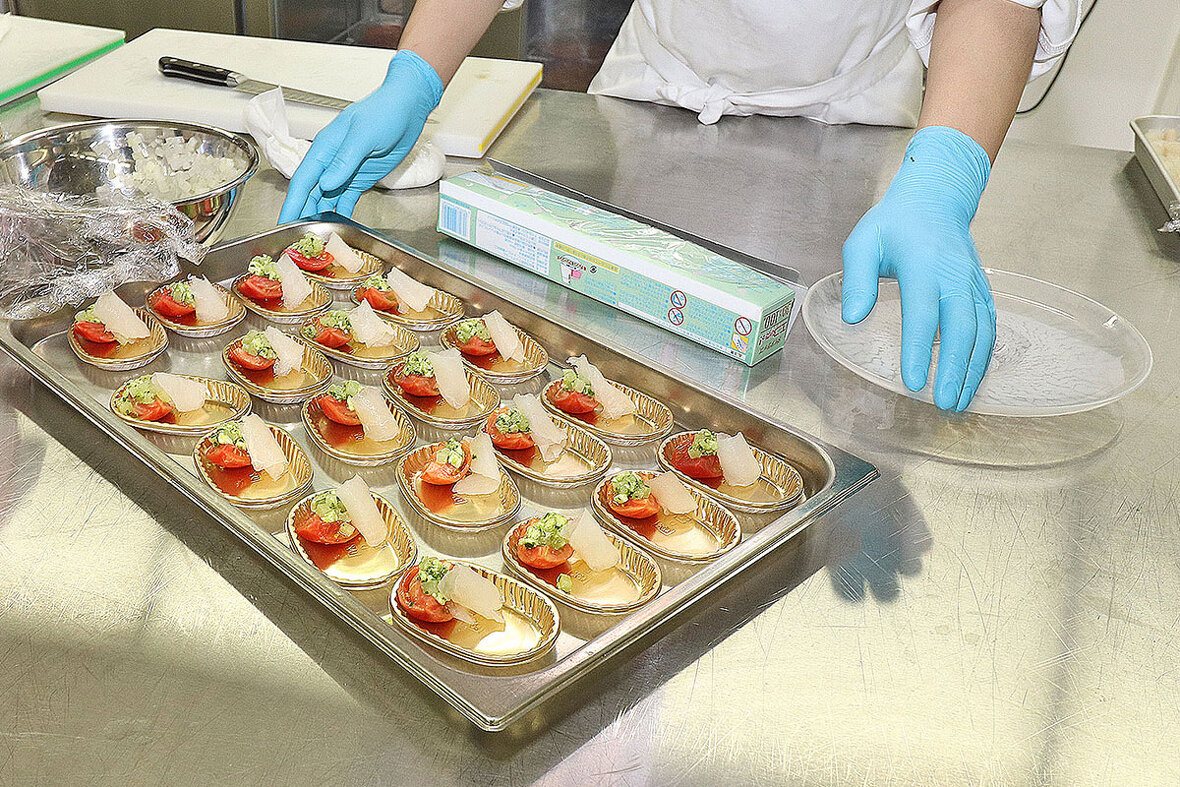 2023年04月17日(月) 高知県産”土佐まほろばトマト”&ウマヅラハギのマリネ カプレーゼをイメージして ◆加工工程 《調理:スチコン》 《包装:シュットマン》 《急速凍結:ラピッドフリーザー》 《解凍》 凍結していたウマヅラハギを氷温で解凍し、フィレに卸す。 トマトソースは提供前に氷温で解凍後、エスプーマボトルに詰めて提供。