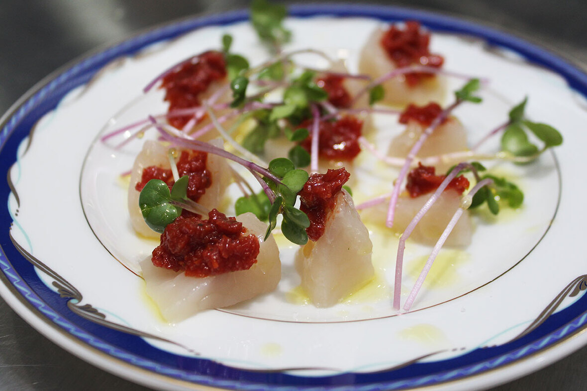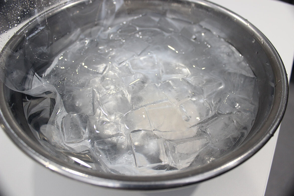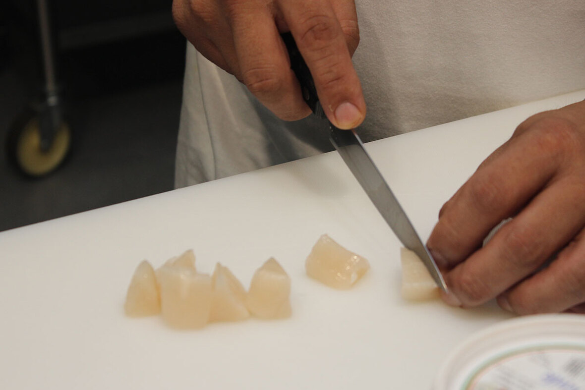 2023年04月17日(月) 活け帆立貝柱のカルパッチョ仕立てジョヴァノットスタイル ◆加工工程 《包装:シュットマン》 《急速凍結:ラピッドフリーザー》 《解凍:氷水》 帆立は仕込み時にペーパータオルで水分を取り除き、ラピッドフリーザーで凍結。 調理実演時に事前に氷水解凍。ドリップが出ず、ハリのある歯ごたえが維持できている。