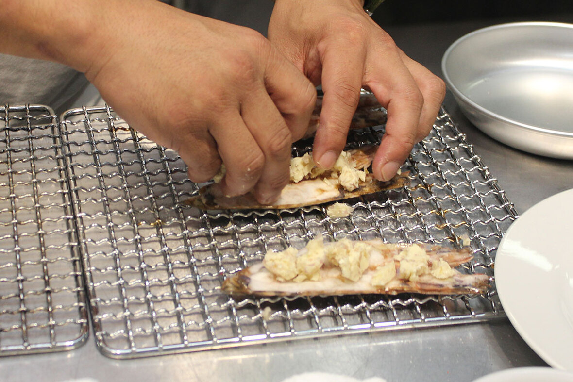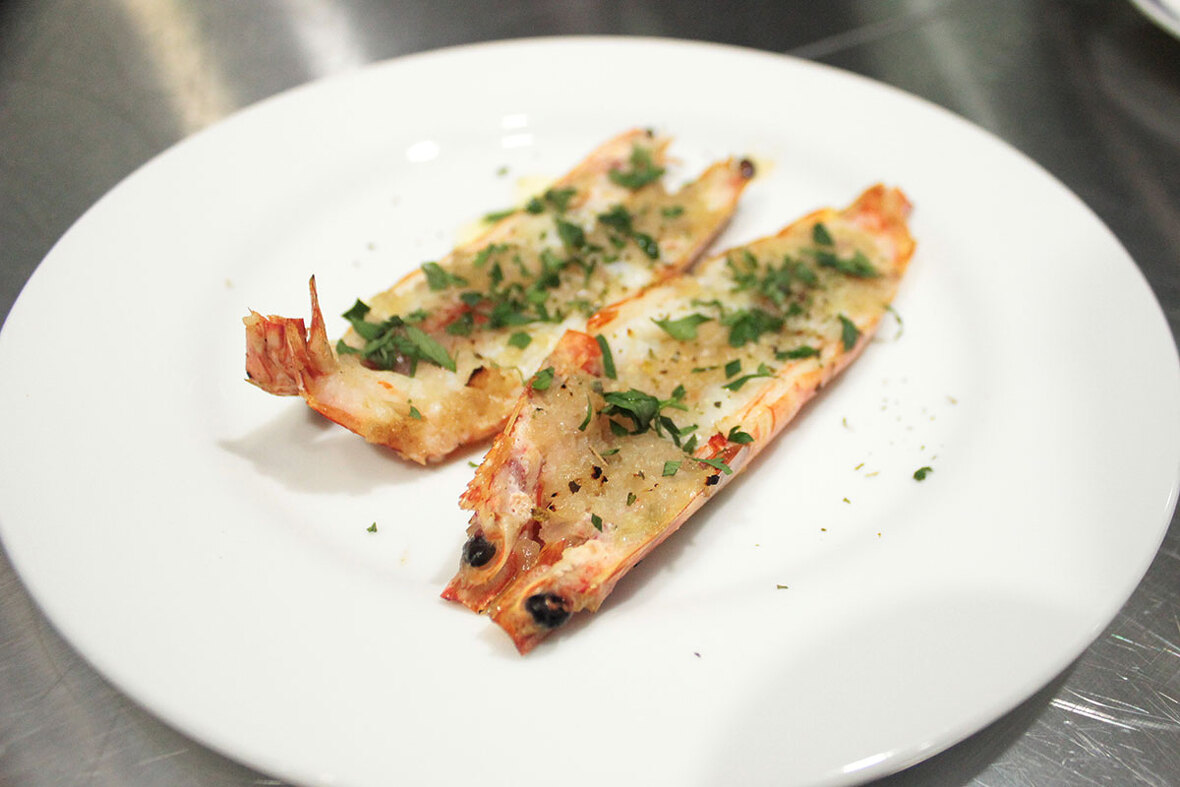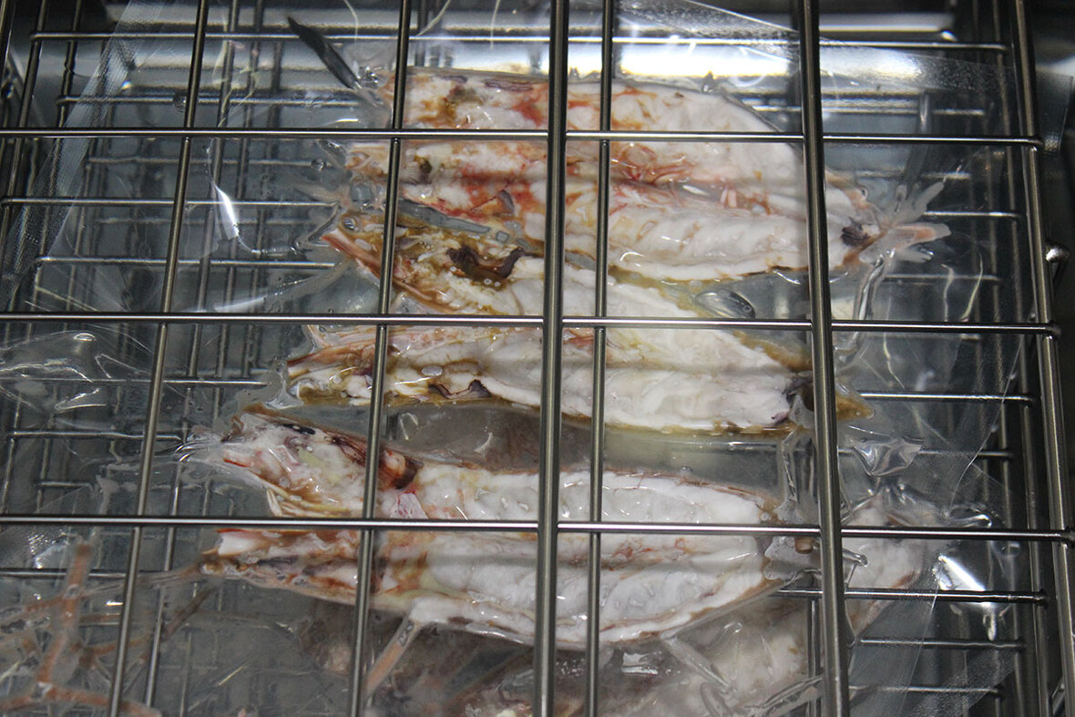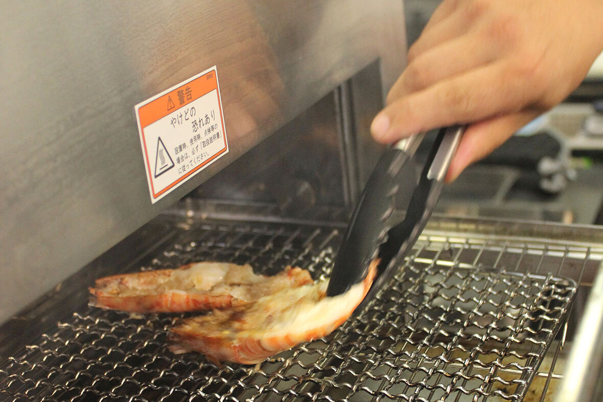 2023年04月17日(月) 車海老の香草バター焼き ◆加工工程 《加工》 《包装:シュットマン》 《急速凍結:ラピッドフリーザー》 《調理》 車海老は半分に開き、ひげなどを取り除き、事前にラピッドフリーザーで凍結。 凍結状態でオーブンで焼成し、味を調整し、盛付して提供。