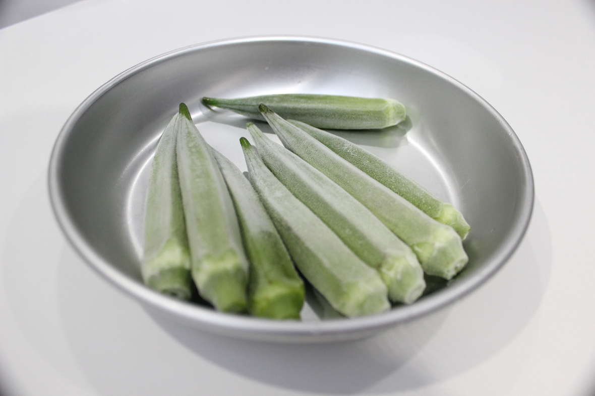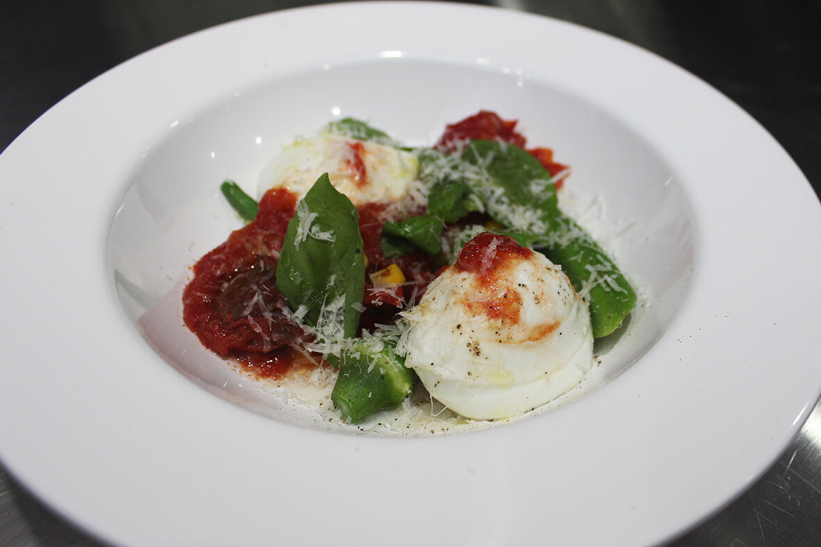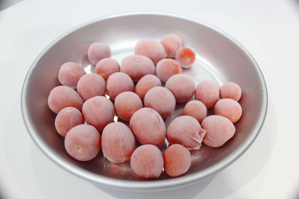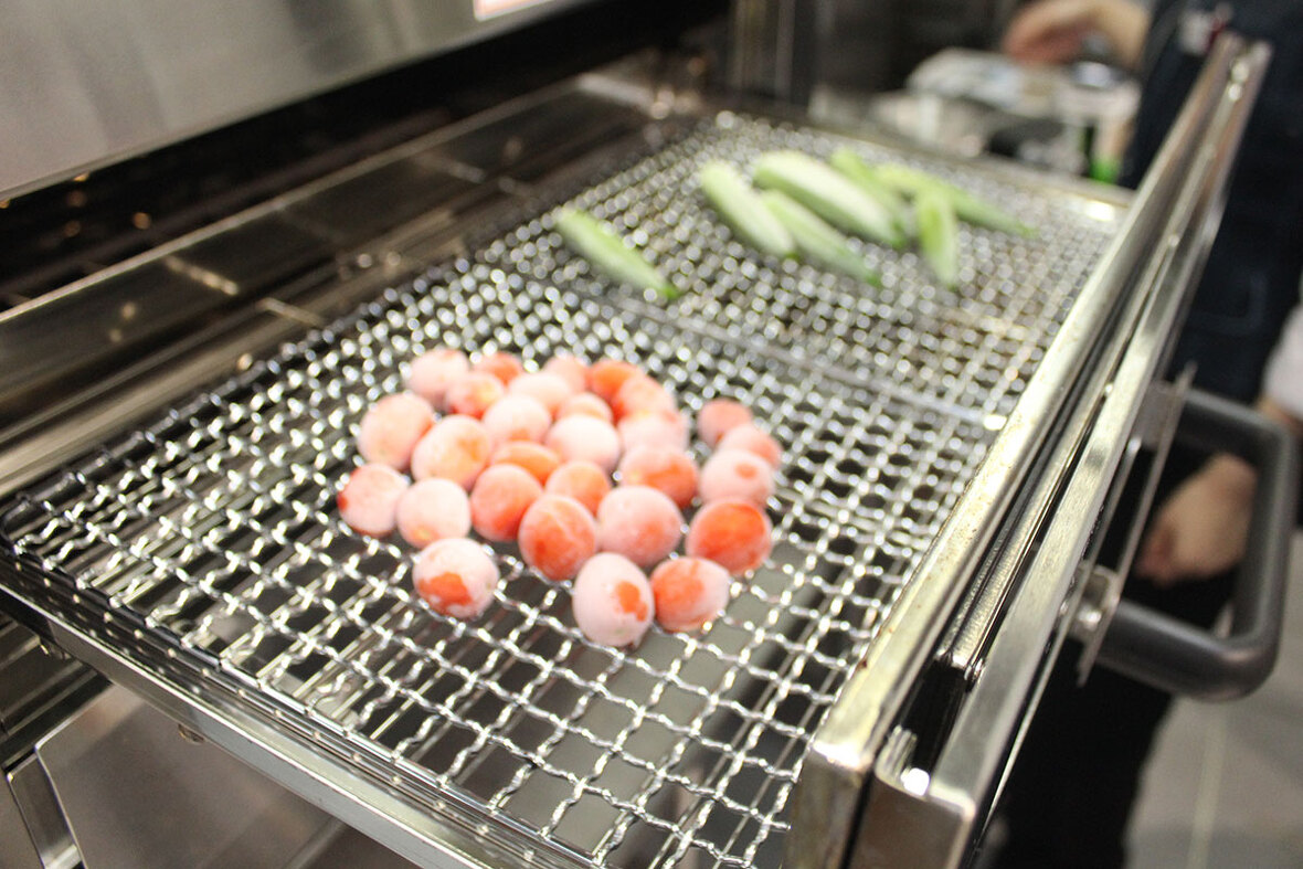 2023年04月17日(月) 夏野菜の温製カプレーゼ ◆加工工程 《包装:シュットマン》 《急速凍結:ラピッドフリーザー》 《調理》 プチトマト、オクラ、トウモロコシ等の具材を事前に凍結し、試食調理時にオーブンで焼成。トウモロコシは仕込み時にシンとの間に甘味があるため、 シンを入れた状態で凍結。解凍後、オクラもしっかりとした歯ごたえのある、美味しい仕上がりになる。仕上げにモッツアレラを添えて提供。