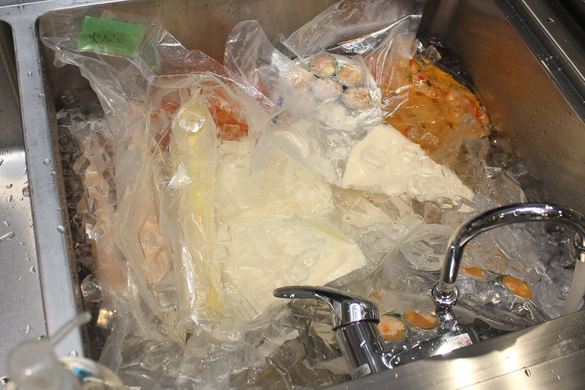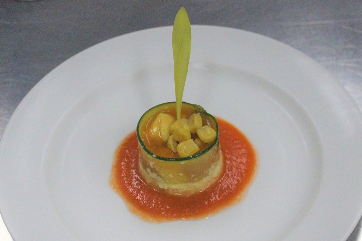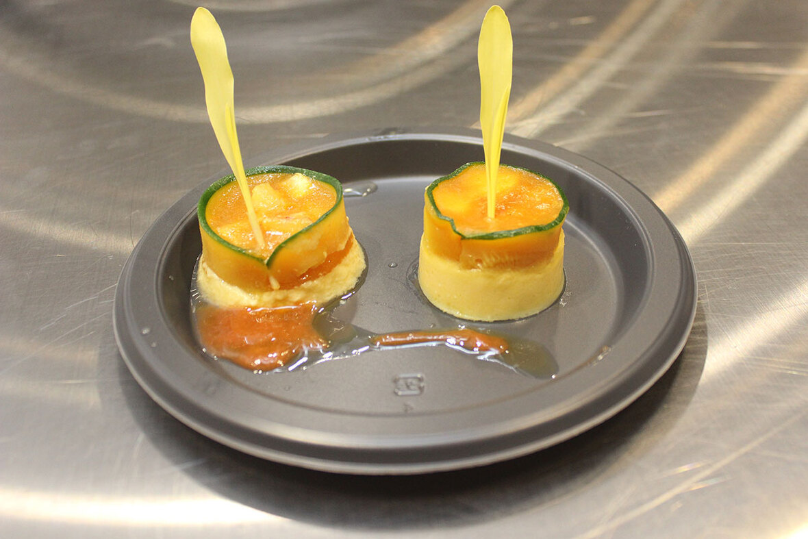 2023年04月17日(月) 鯛のユール仕立てトウモロコシのフランとトマトのクーリー添え ◆加工工程 《調理》 《包装:シュットマン》 《急速凍結:ラピッドフリーザー》 《解凍:氷冷》 ユールを固めるゼラチンへの影響と寒天との違い、全卵を入れ、凝固させ、凍結させたときの影響及び分離状態が戻るかを検証。 当日の仕込み時に氷水解凍を行った。 分離もなく、凍結したものはセルクルから外す際の作業性が良く、盛付時の型崩れもなく良い仕上がりになりました。